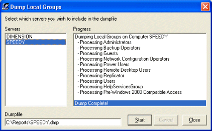 This tool is a support function to the Find Membership functionality. If you use this function you might find it somewhat slow to search through many servers for a group membership. To speed up this process you have the option to generate a "dumpfile" of all local groups on one or more selected servers. This file is then used in the Find Memberships dialog to speed up the search, this however predumes that you do this dump on a regular basis. Otherwise the result will be unreliable.