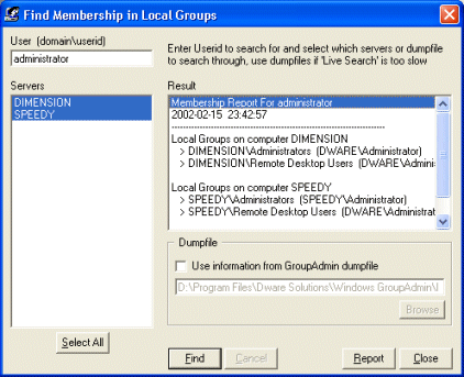 In order to get accurate results by using the dumpfile, always generate a new one before using the Find Membership tools. The dumpfile is generated by using the Dump Local Groups utility. If this file is generated on a regular basis the dumpfile might be the option to use for you. If you want to use the dumpfile or do a direct search depends heavily on the size of your network environment. In large corporations it is normally necessary to use the dumpfile to get reasonable responstimes.