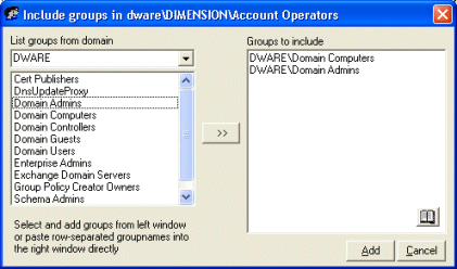 You have the option to either specify which domain you want to list groups from or select one of the presently listed. The approach is exactly the same as when you are adding users. If the group you are specifying is not found or if the group is already included, you will be informermed about this.