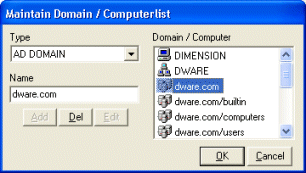 This is the place where you add and remove the Computers, OU:s and NT domains you want to manage with the GroupAdmin application. Simply select whether it is a Domain, Active Directory domain (AD-Domain) or Computer you want to add, type the name of the domain or computer and press 'Add'