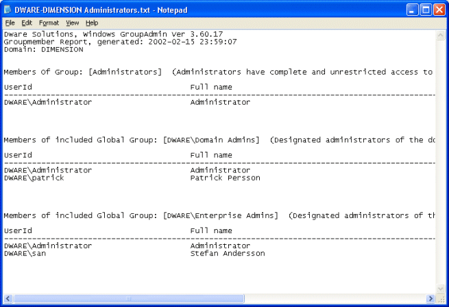 The picture below is a small sample of a typical report generated with Dware GroupAdmin.