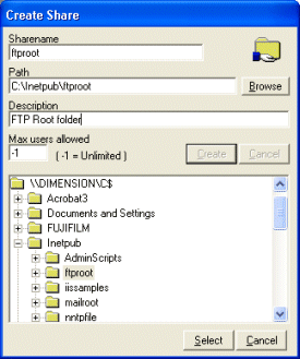 To find the folder you want to share, press the "Browse" button, the dialog will then expand and let you browse and select the folder you want to share. The Sharename and Path are mandatory, the description field is optional to use.